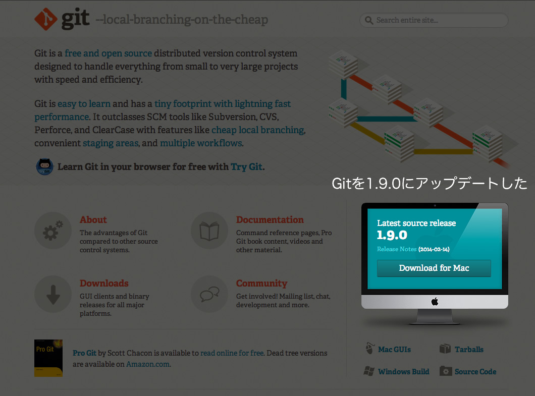 バージョン管理で、自分も利用している Git の 1.9.0 がリリースされていたので、自分のPCでのバージョンも最新版にアップデートしてみました。
